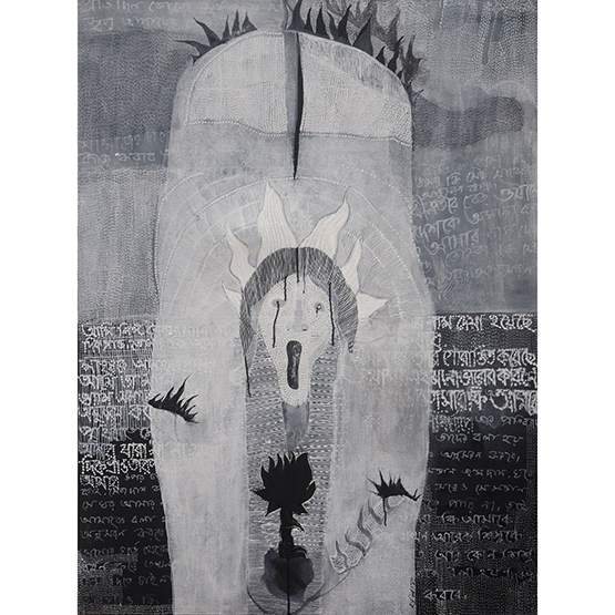 The work of Dilara Begum Jolly was included in the exhibition, A Beast, a God and a Line (Dhaka Art Summit, 2018). Bengal Foundation has organised several solo exhibitions of Jolly’s work, including Excavating Time (Bengal Gallery of Fine Arts, Dhaka, 2006), Threads of Testimony (Dhaka, 2014) and microtears’/Omorar Akkhan (Daily Star-Bengal Arts Precinct, Dhaka, 2015).